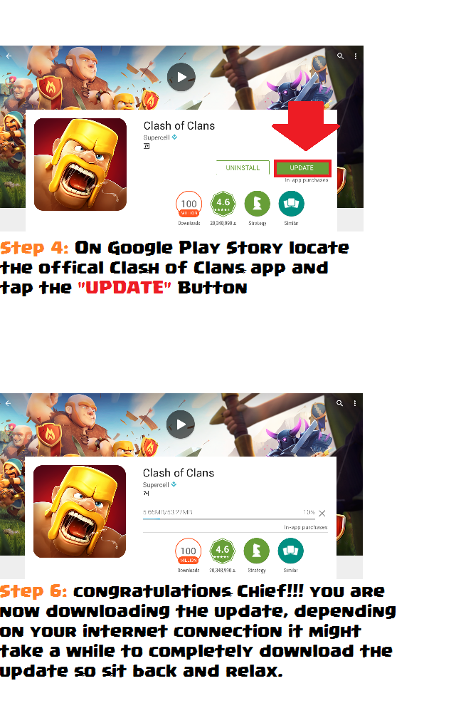 Try clearing your google play store data then updating Clash of Clans! This worked for me!Hope it works for you all as well!