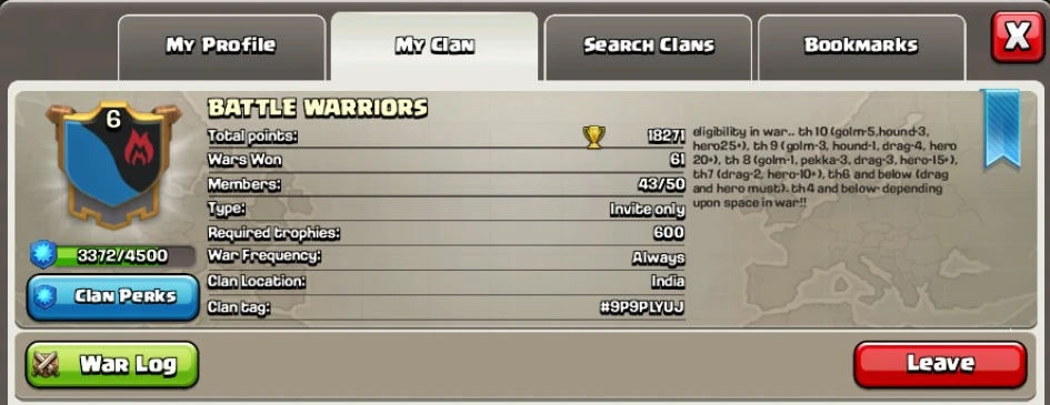How to find us http://vignette2.wikia.nocookie.net/...42&format=webp Clan nameBATTLE WARRIORS Clan tag #9P9PLYUJ Location India