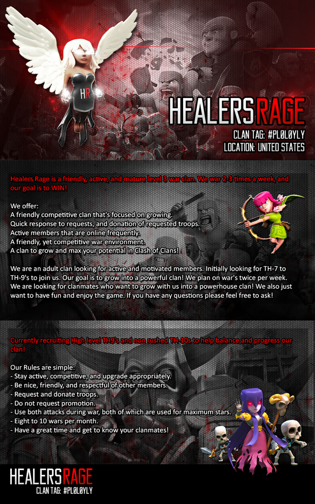 We are in the process of rebuilding our clan with active experienced attackers to take our clan to the next level of being a competitive, and potentially highly ranked clan. If you want to join us and be a part of an awesome team check us out!