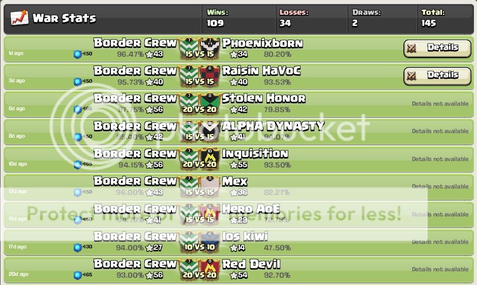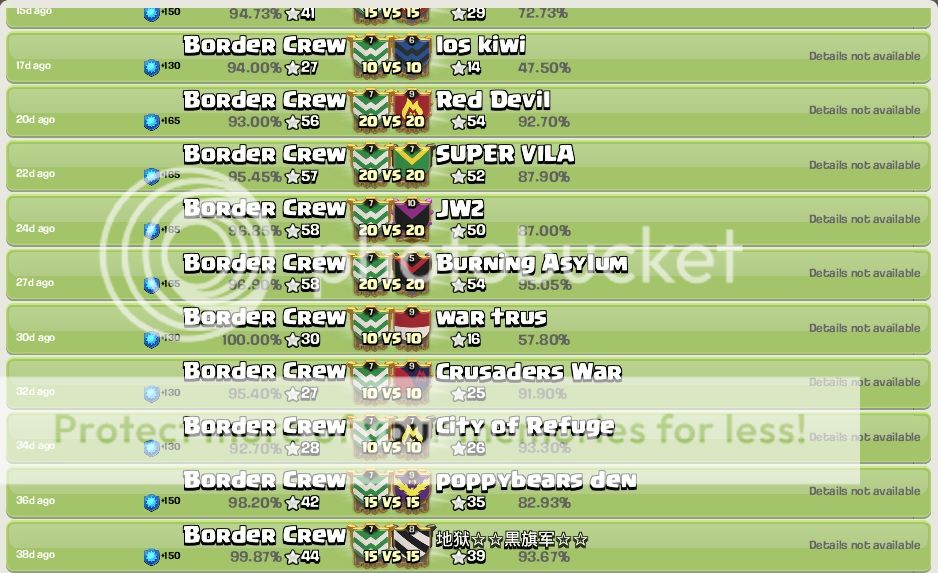Border Crew is a lvl 8 clan. We're loyal and dedicated. Based in the US. We have a lot of fun sharing replays, talking strategy, and participating in war. Donations are high level and plentiful. We like to have fun and we like to win. We are hardcore enough to win wars but not so hardcore that we take the fun out of it.