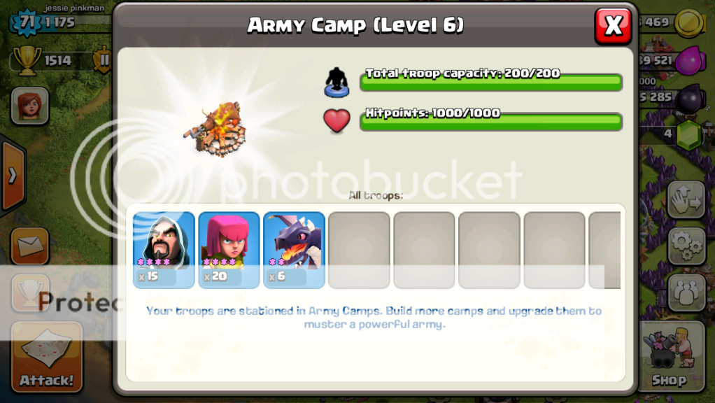 1800-2100 trophies. I do have a King and Queen now, but only use them occasionally. I typically take 2 rage, 1 heal, and 1 lightning, but don't use the spells much. My clan castle is usually archers, sometimes a wizard or two, sometimes a few minions, occasionally a dragon; I don't use my castle much on attack though.