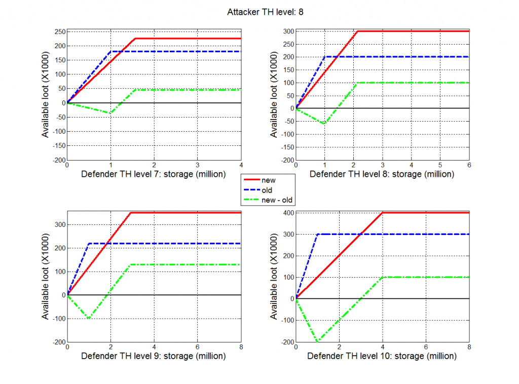 3. Due to the increase in the caps of loot at each TH level, especially for TH 9 and 10, losing two storages may results the same effect as losing all the storages in the old system.