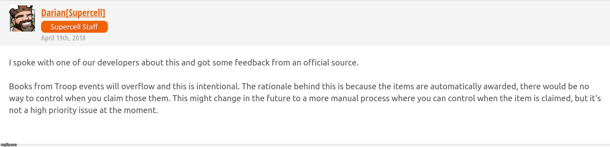 I'm sad its going to happen. Kinda was fun to stack items. Definitely devalues troop events if someone is over the limit on items.