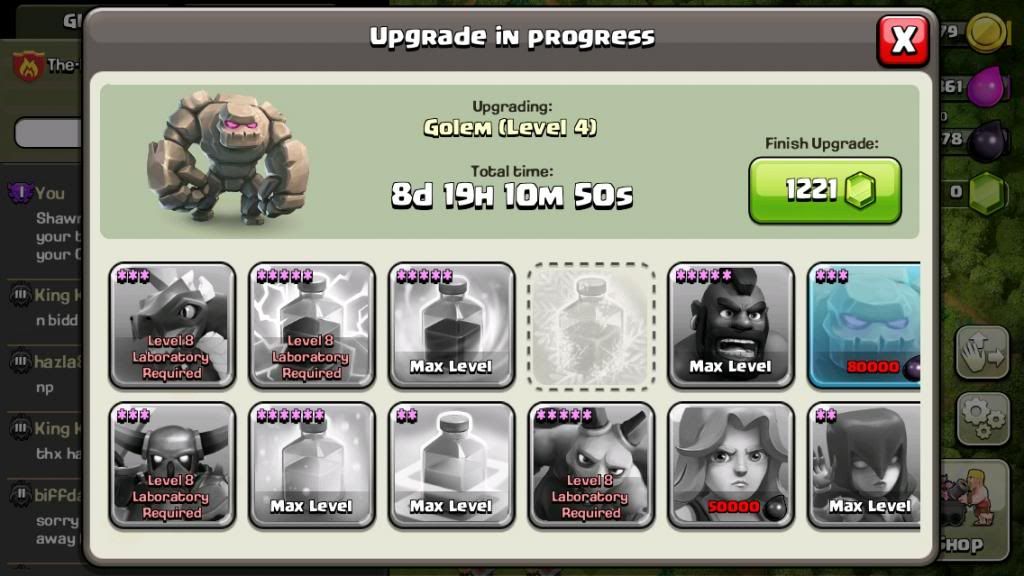 Thank you for your response. All of my troops are maxed with an exception of the Valkyries, they are still level 1. Golems to level 4 are in the oven for another 8 days until the lab is all done. Becca would like to know if her CC can be upgraded and ready to participate by the time of your event. Shawn's golems aren't maxed, nor are his Valkyries.