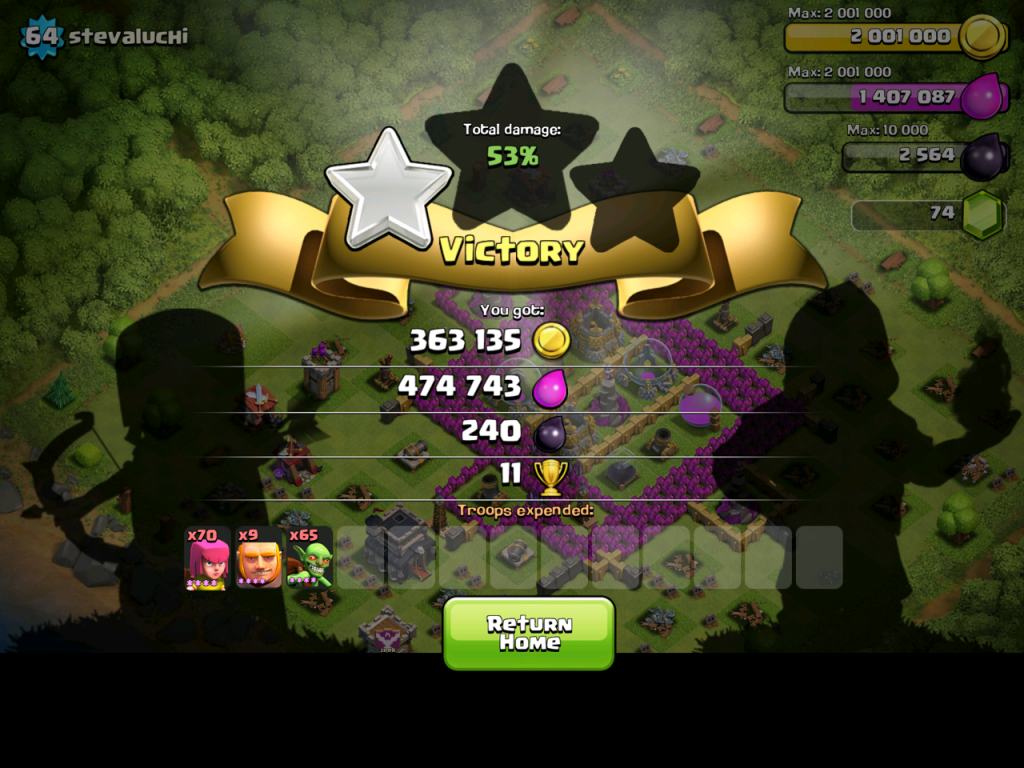 That's awesome! I didn't get quite all the loot because I wasn't watching the clock and ran out of time. Only left about 40k elixir out there though only using 54 archers. Works for me! :D