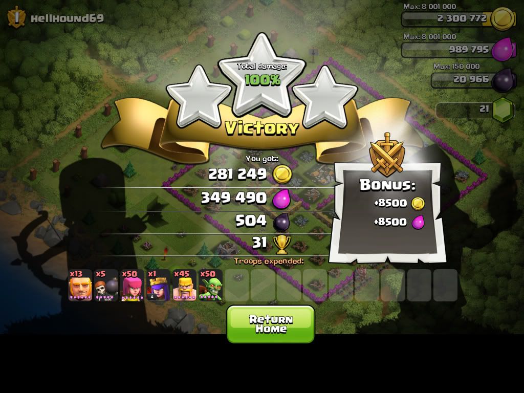 i am lvl 60 farmer still at th7 finishing my lvl 5 air defence and working on my 2 lvl 1 teslas to go to lvl 3.. i am finding great bases of 300-200 resources total every raid i do.. i search 10 times and i find good resources this is at 1200-1300 for a th7.. plz dont come there.. u might find me and steal my resources grrr :) happy resourcing guys.. yes new word (resourcing.) its mine plz contact me for copyright if u want to use it ;) lol can somebody tell me where my signature could be? cant find where to put it ^_^