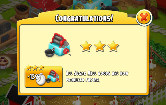 I was so excited that my sugar mill is just 5 hours away from its first star until I realized getting 1 star only meant the product is worth 10% more when sold to truck orders. Only when it's fully upgraded to 3 stars do we get the production time reduced by 15%.