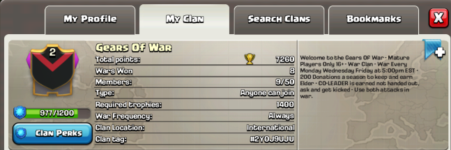 We are the Gears Of War, We are a war clan but better yet a friendly family clan to be apart of, we are a mature clan who enjoy playing the game, winning wars and having a fun time in the clan chat. We are constantly looking for new members so if you are a mature player looking for a fun clan to be apart of and you also want to win wars and be apart of the foundation of this clan, then look no further your perfect clan is here waiting for you!