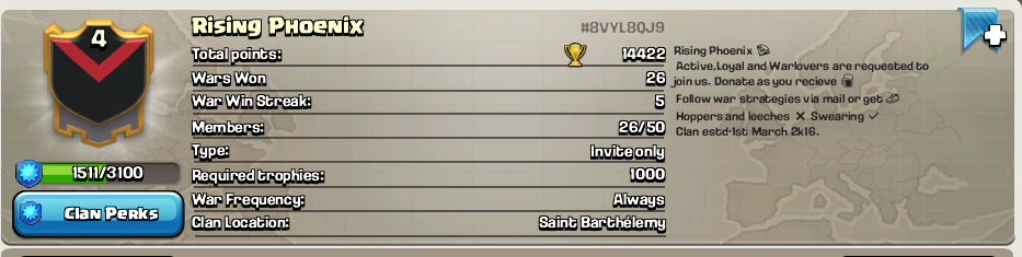 We are an active, war loving clan that is looking for active and loyal members.Our clan was established on the first of March, 2016.