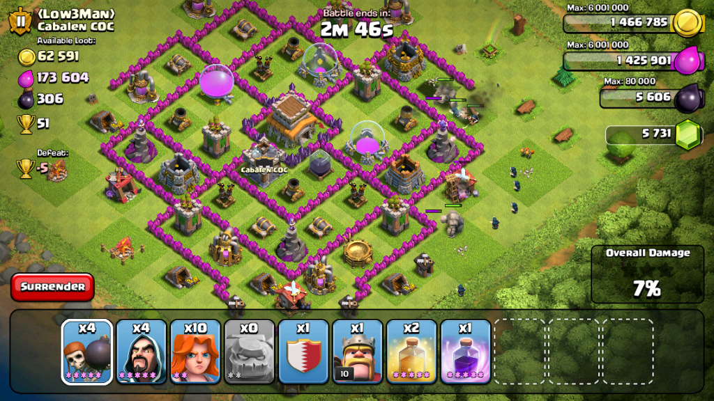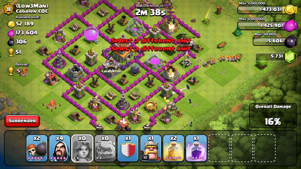 Be prepared to start using Spells- This is where things start to get tricky! With the assumption that you decided to ignore the CC -like I do-, you will undoubtably be facing CC troops by now! This is where your first Healing Spell will come in handy! The Wizards will have filed in after the Valkyries and Golems by now, so with any luck, all your Tanks will be taking the majority of the hits by now! That healing spell should keep them up in health while the CC troops are taken out! If you're lucky, your troops will have already progressed deep enough into the base that you're either right outside of the core or already inside! Then, you may drop your rage spell so that it hits the Valkyries and Wizards so that they can power through the CC troops and into the core. The rage will also super-charge your Valkyries while they punch into the core (coincidentally directing them), if the WBs didn't do the trick in the first place! You're only bringing 6 total Wall Breakers, so you can expect that a densely pocketed base will prove to have that issue (even if you bring more than 6 WBs).