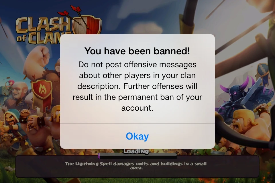 Now, I don't know that any of this is going on. I have been gone for two days. I finally get a chance to log on and see how things are going. Just prior to me logging on, whatever robot that reviews the reports finally takes action against our clan and bans all of our leadership. So, when I go to long on I am greeted with this: